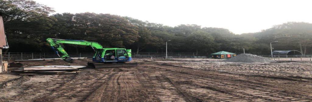 Afgelopen maand veranderde de bospaddock in een opstelplaats voor de grote hooi-rollen, en kwam er meer parkeerruimte vrij aan de voorzijde. Een nieuwe rij stelconplaten en een hek met 8 ruiven werden geïnstalleerd, zodat het voeren van de paarden veiliger en makkelijker gaat. De hooiberg werd met damwanden bekleed, en de 2 paddocks werden omgespit en geëgaliseerd met 200 m3 nieuw zand. In december van dit jaar maken we nog een begin met de renovatie van 8 binnen-stallen.