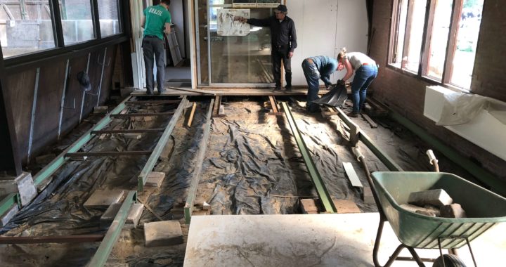Nadat eerst al het meubilair er uit gehaald is, konden daarna de kasten, keuken en vloer eruit gehaald worden. Vervolgens kon de aannemer beginnen met het storten en isoleren van een nieuwe vloer.